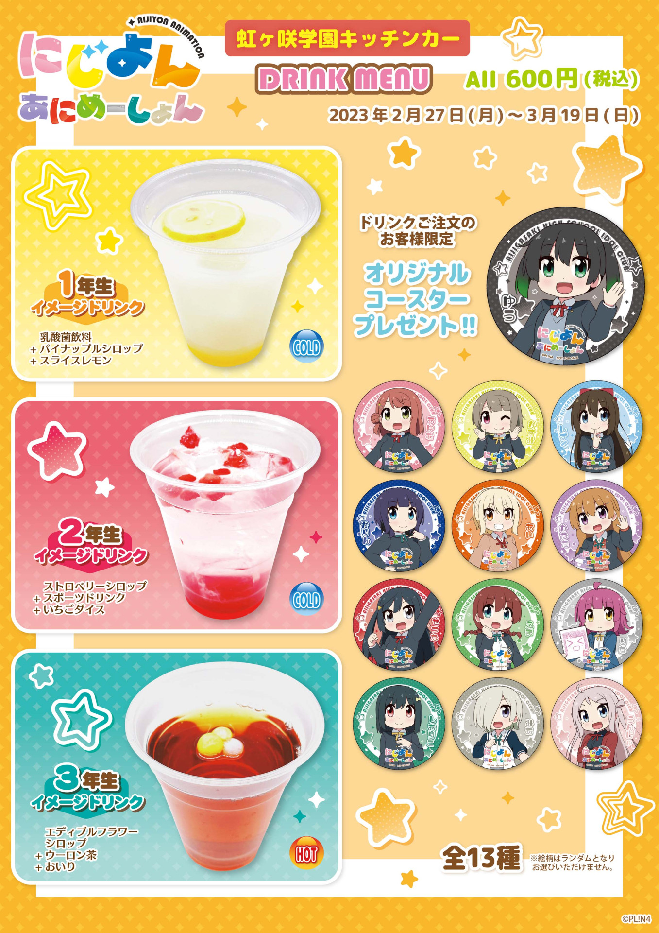 種類 :全13種(高咲 侑、上原 歩夢、中須 かすみ、桜坂 しずく、朝香 果林、宮下 愛、近江 彼方、優木 せつ菜、エマ・ヴェルデ、天王寺 璃奈、三船 栞子、ミア・テイラー、鐘 嵐珠)