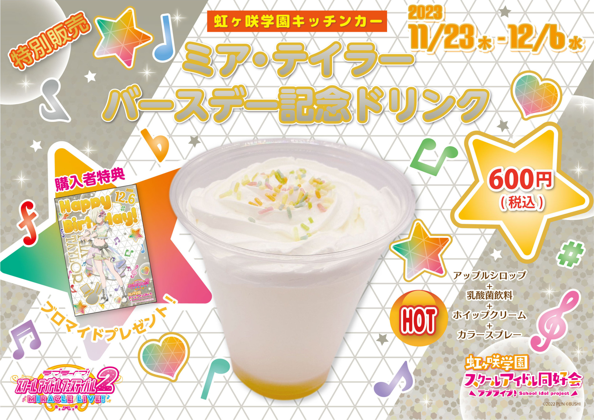 下記期間でバースデー記念ドリンクメニューの販売、記念ドリンク購入者様への特典ブロマイドお渡し、メッセージボードの展示をいたします。