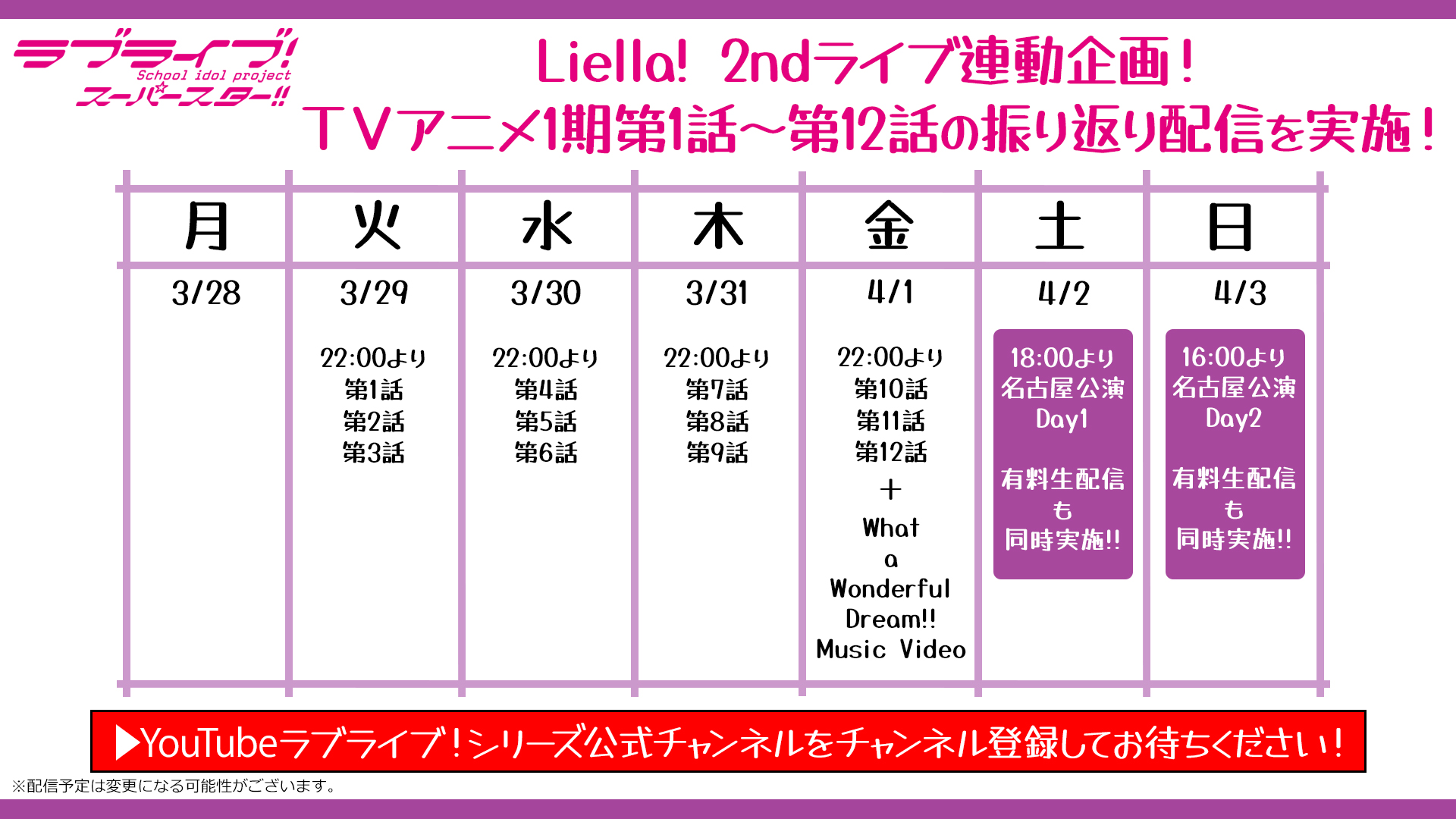 配信はYouTubeラブライブ!シリーズ公式チャンネルにて実施いたしますので、