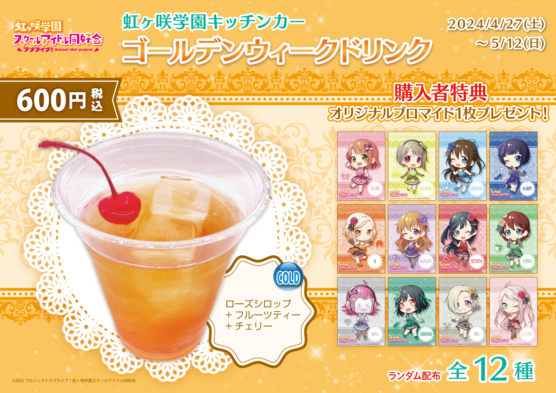 2024年4月27日(土)~2024年5月12日(日)の期間で限定ドリンクの販売、限定ドリンク購入者様への特典ブロマイドをお渡しいたします。
