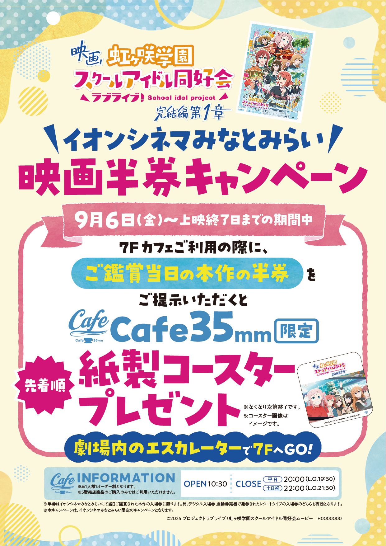 映画『ラブライブ!虹ヶ咲学園スクールアイドル同好会 完結編 第1章』×イオンシネマみなとみらい映画半券キャンペーンの実施が決定いたしました。 イオンシネマみなとみらい内にあるCafe35mmご利用の際に、本作の半券をご提示で”Cafe35mm限定 紙製コースター“を先着でプレゼント!