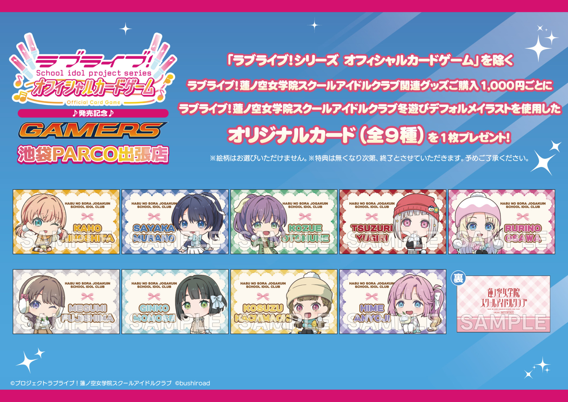 「ラブライブ!シリーズ オフィシャルカードゲーム」を除くラブライブ!シリーズ関連グッズご購入1,000円(税込)ごとにシリーズに応じた冬遊びデフォルメイラストを使用したオリジナルカードを1枚プレゼント!