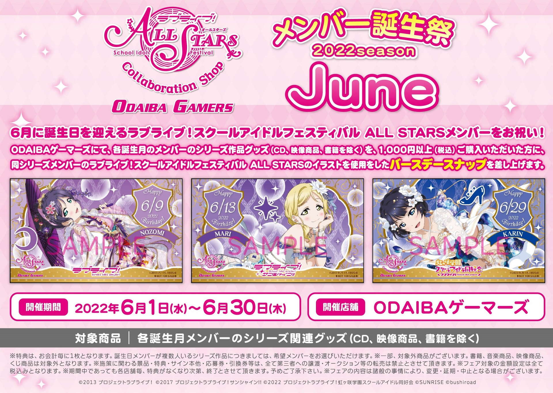 ODAIBAゲーマーズより6月のスクスタメンバー誕生祭フェアのお知らせ